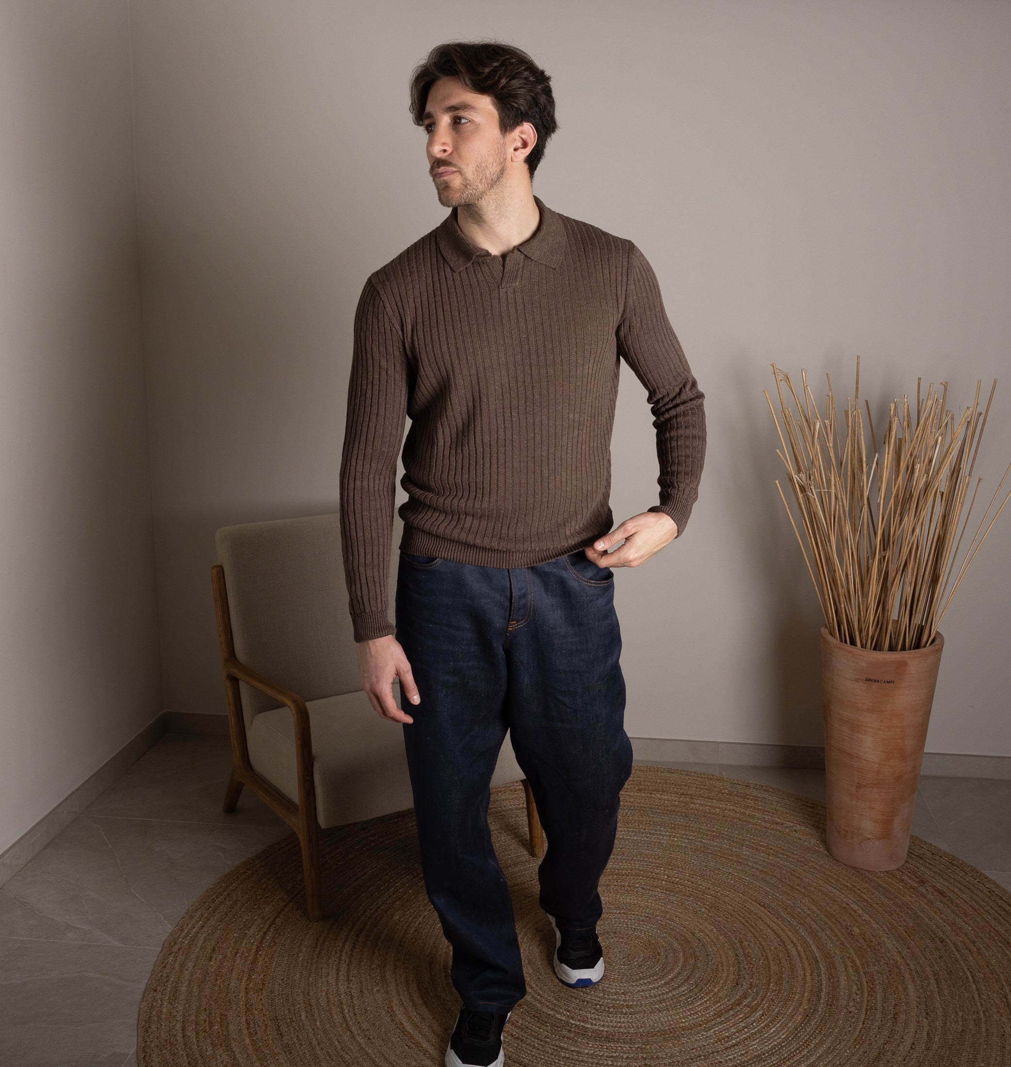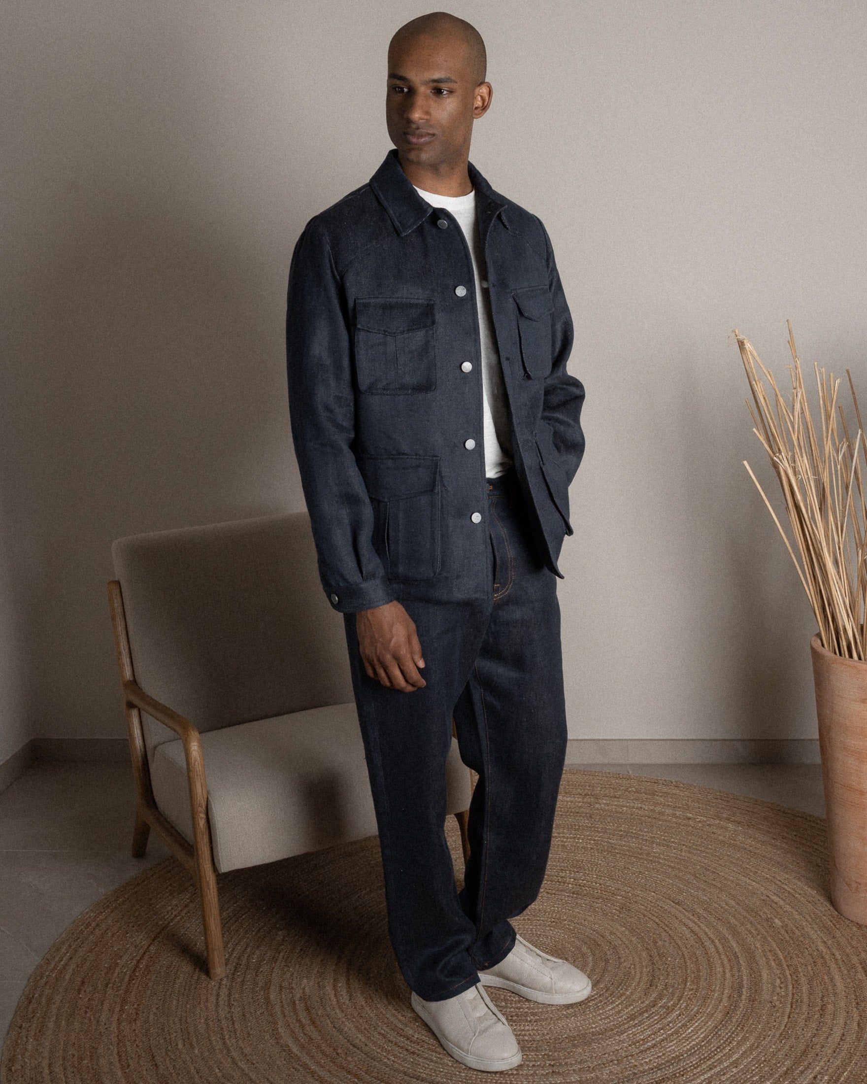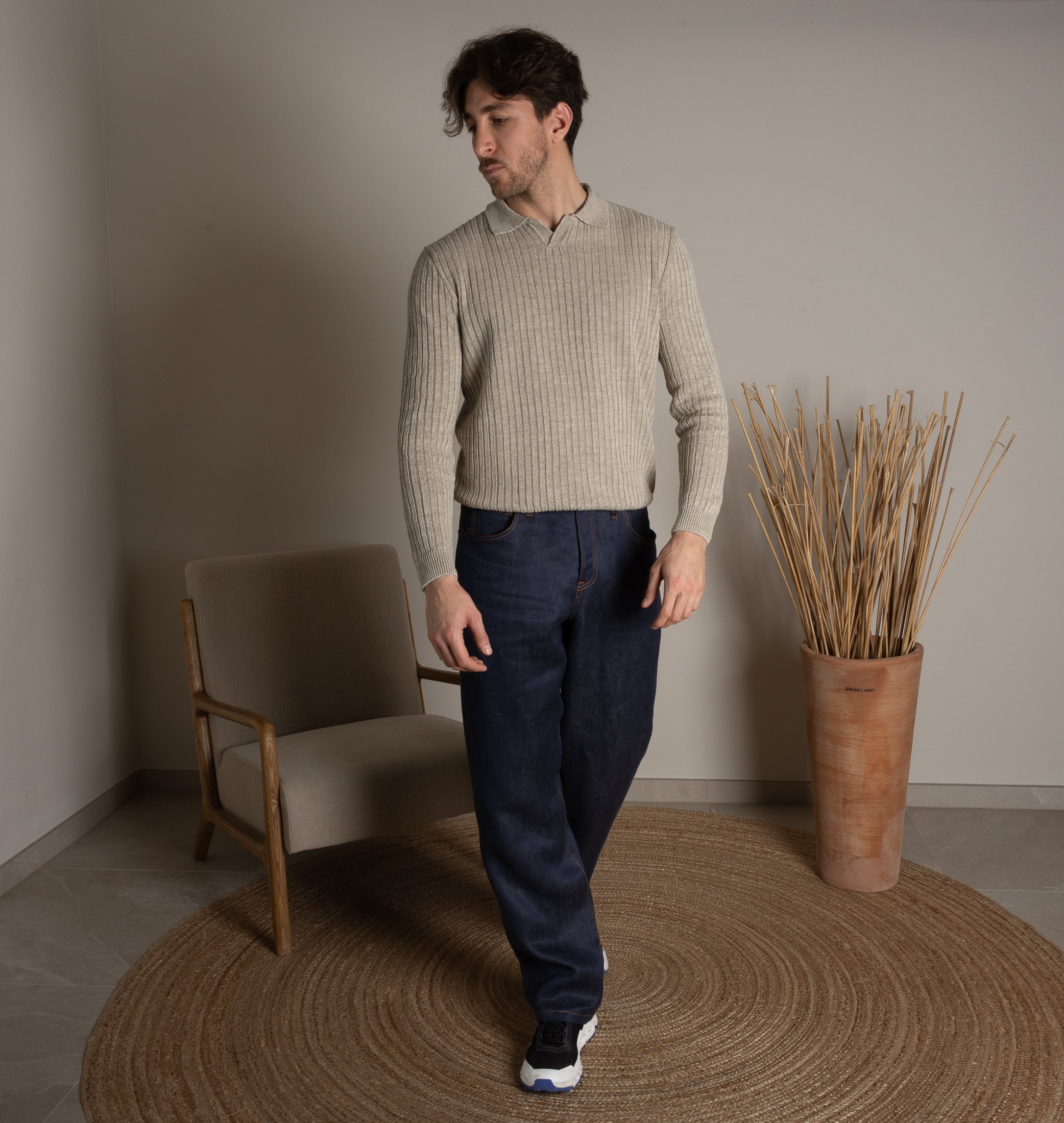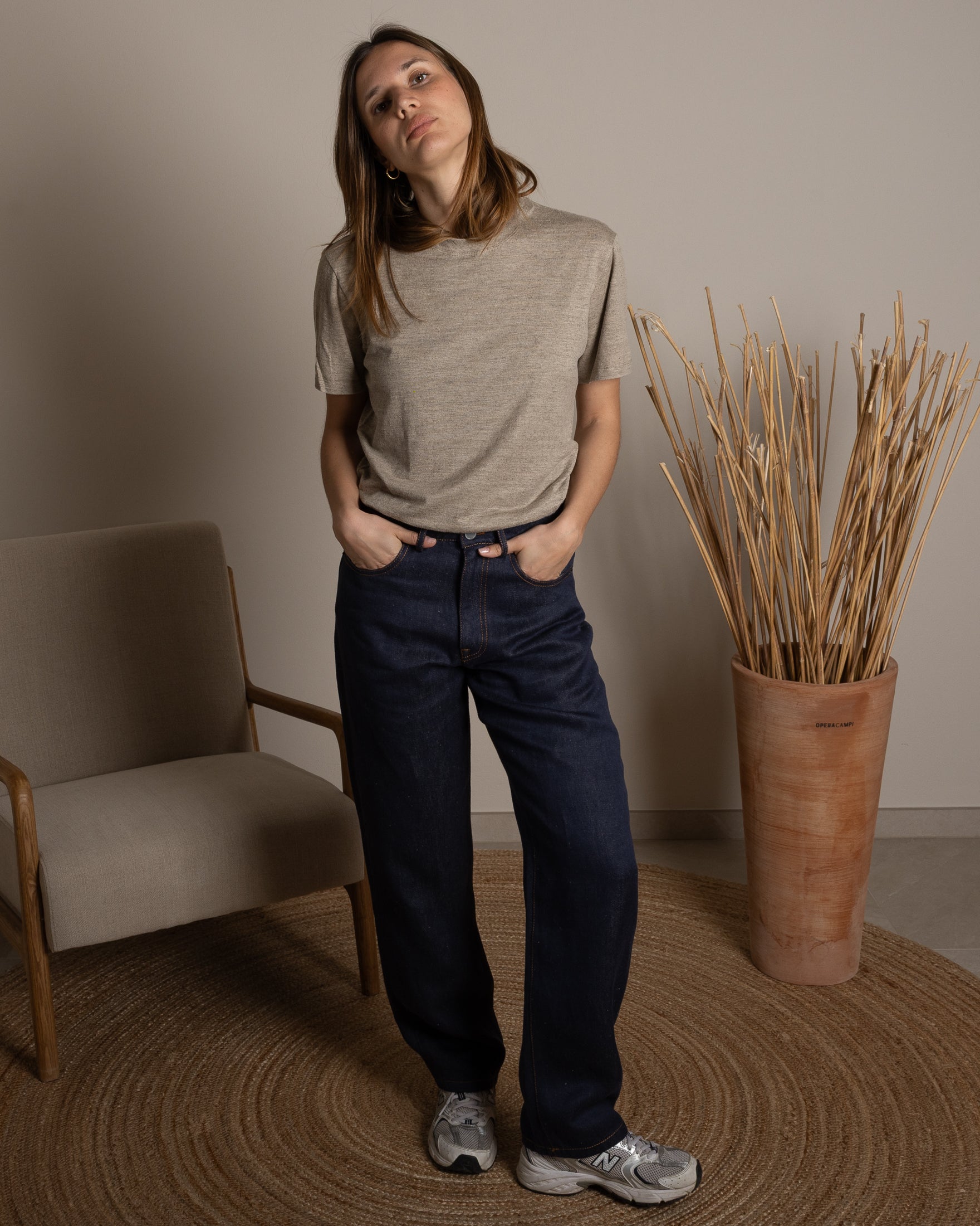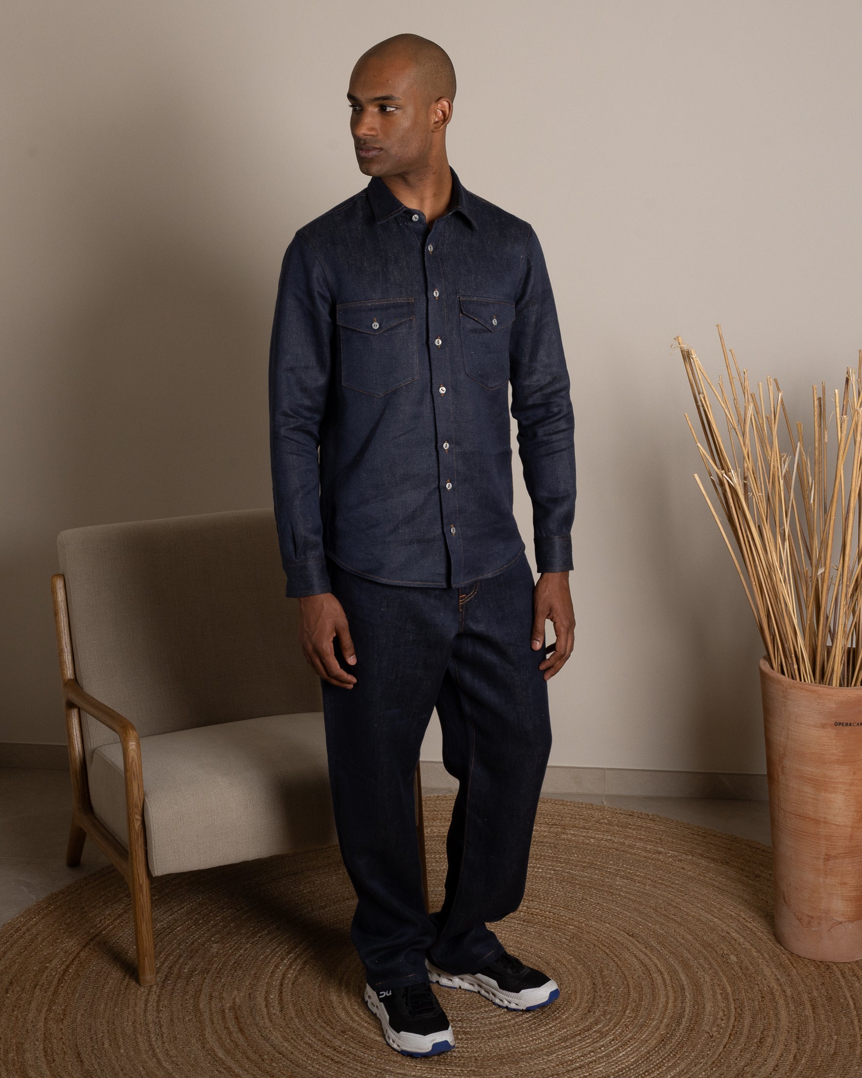 El Jeans 100% Cáñamo. Una super tela que hemos llamado “Denim Primitivo” porque se asemeja a un denim más preciado y antiguo, con una textura rústica. Teñido hilo por hilo, retorcido para hacerlo aún más duradero.