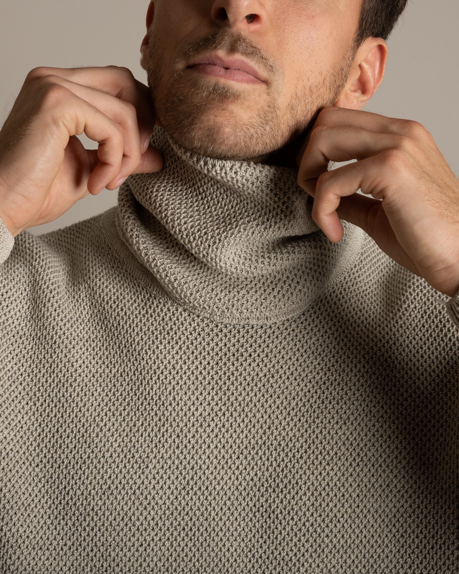 El suéter grueso y cálido gracias a la composición 100% Lanapa® (30% de Canapa de alta calidad y 70% de lana merino australiana ultra-fina). La estructura de punto romboidal y tridimensional maximiza las propiedades termorreguladoras y aislantes del valioso material, manteniendo un aspecto extremadamente limpio.