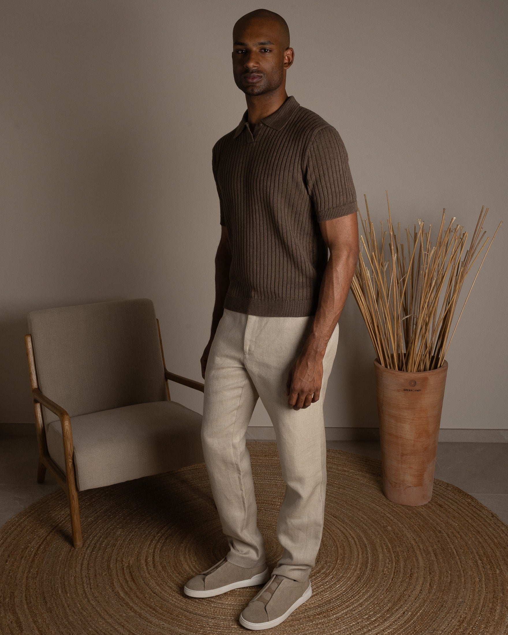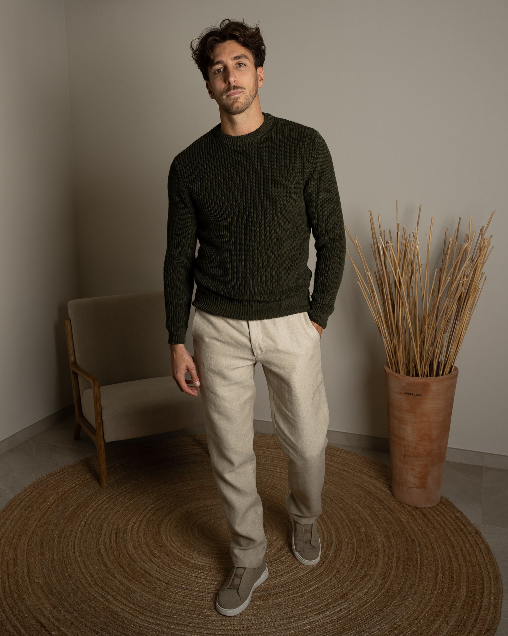 El pantalón de cáñamo a medida, realizado en Italia con los hilos más finos. Corte limpio, elegante y moderno.