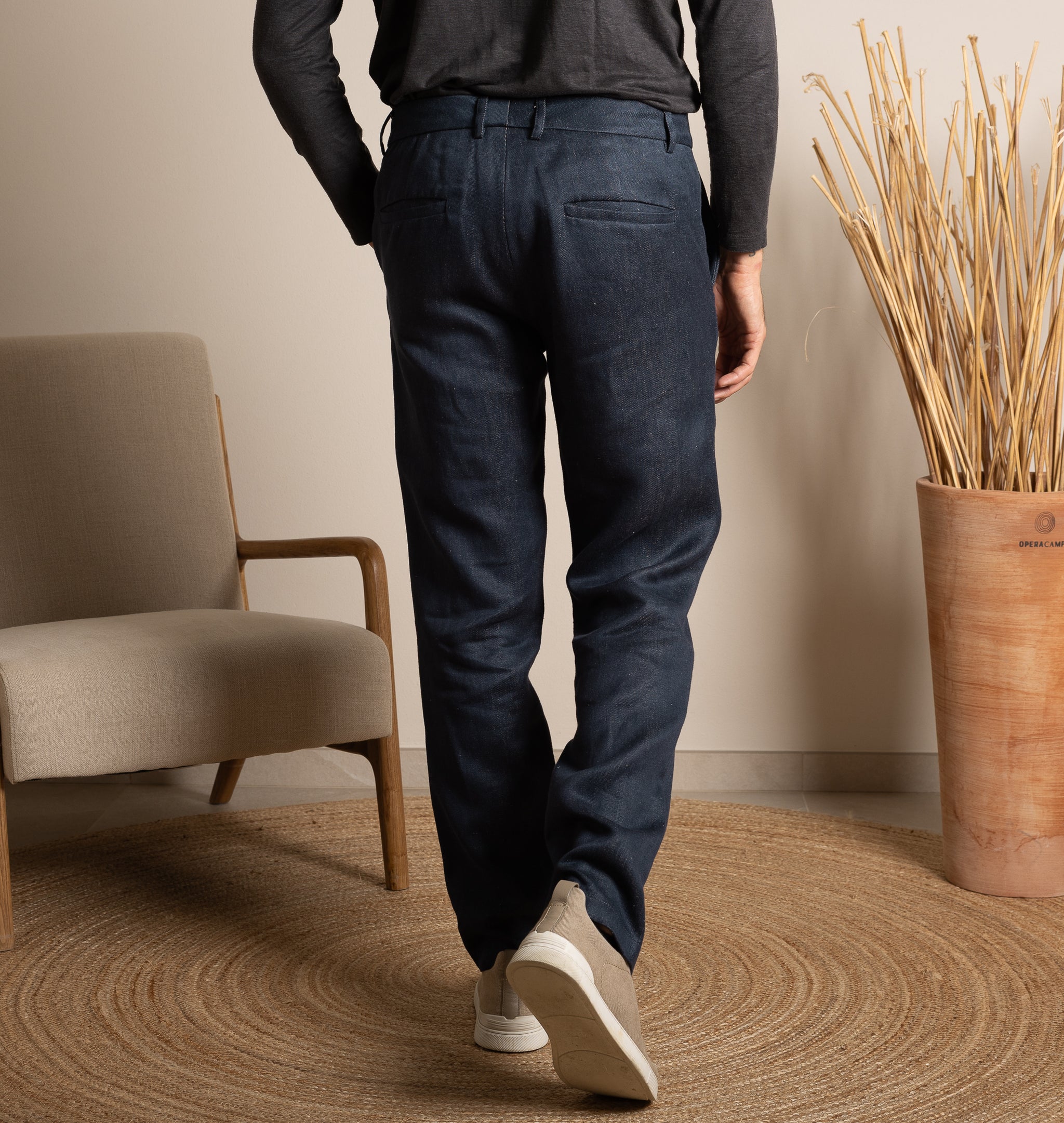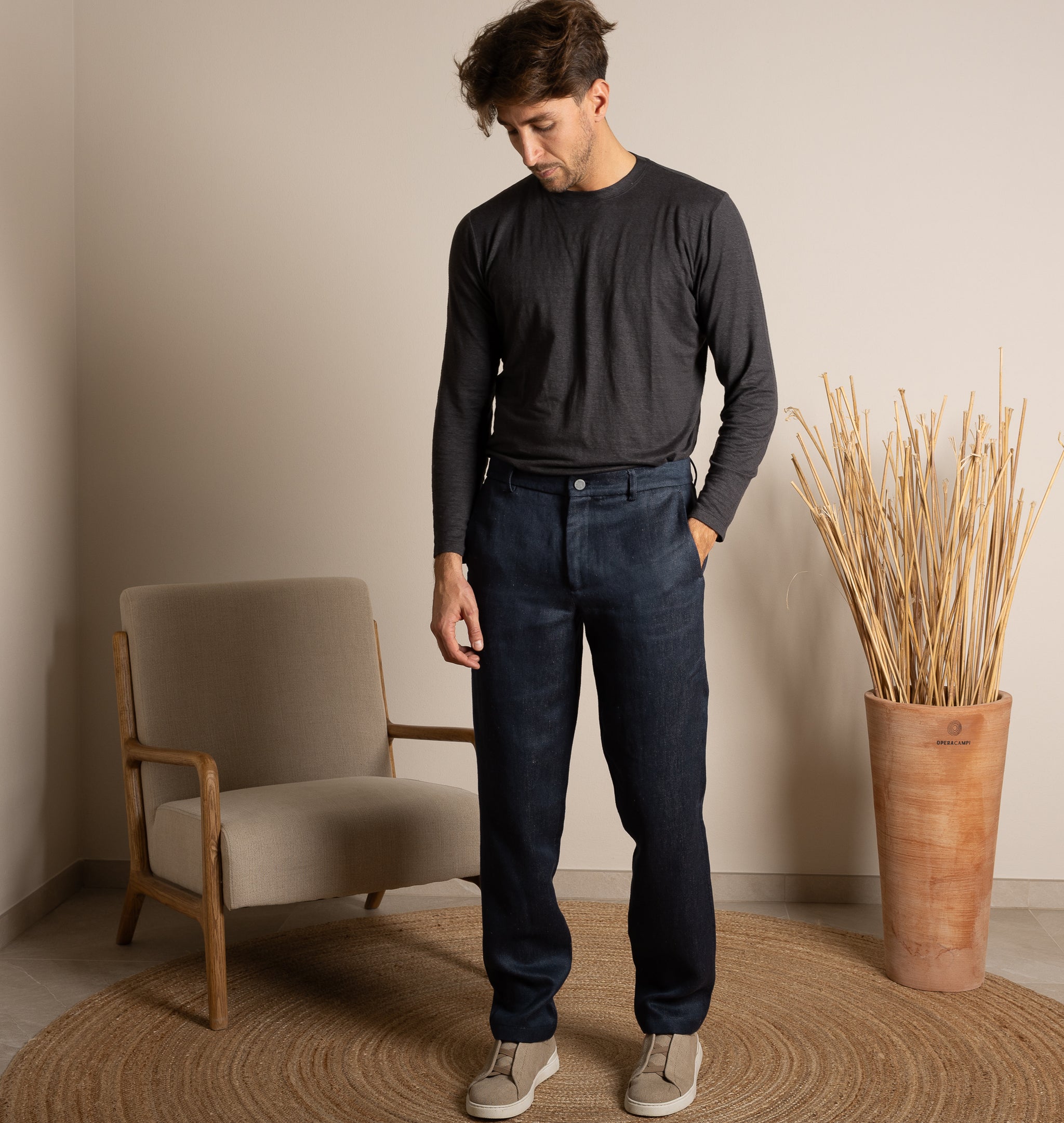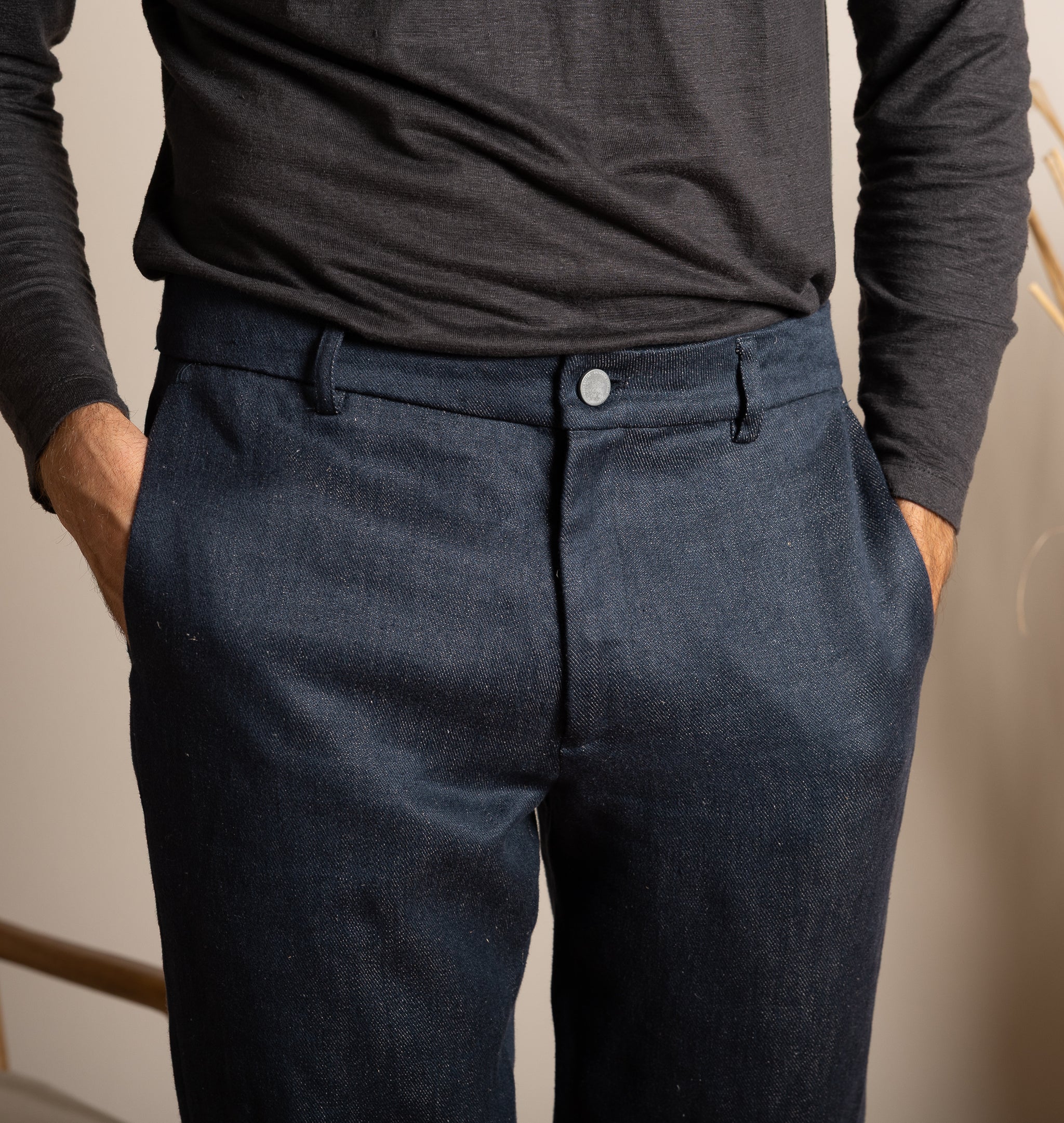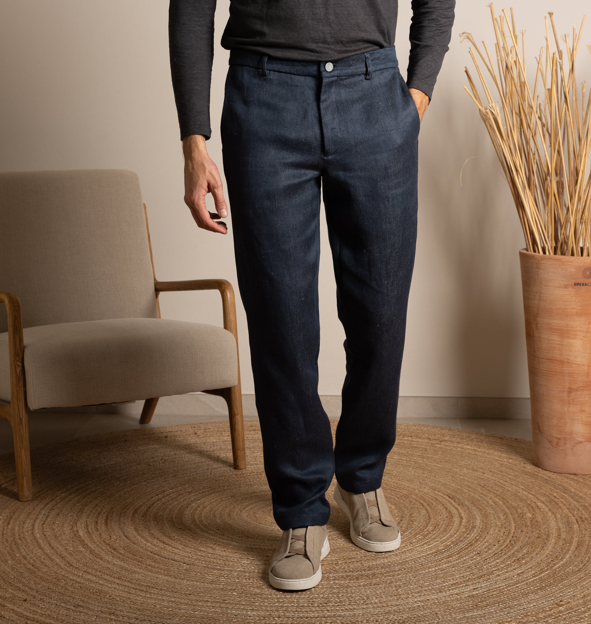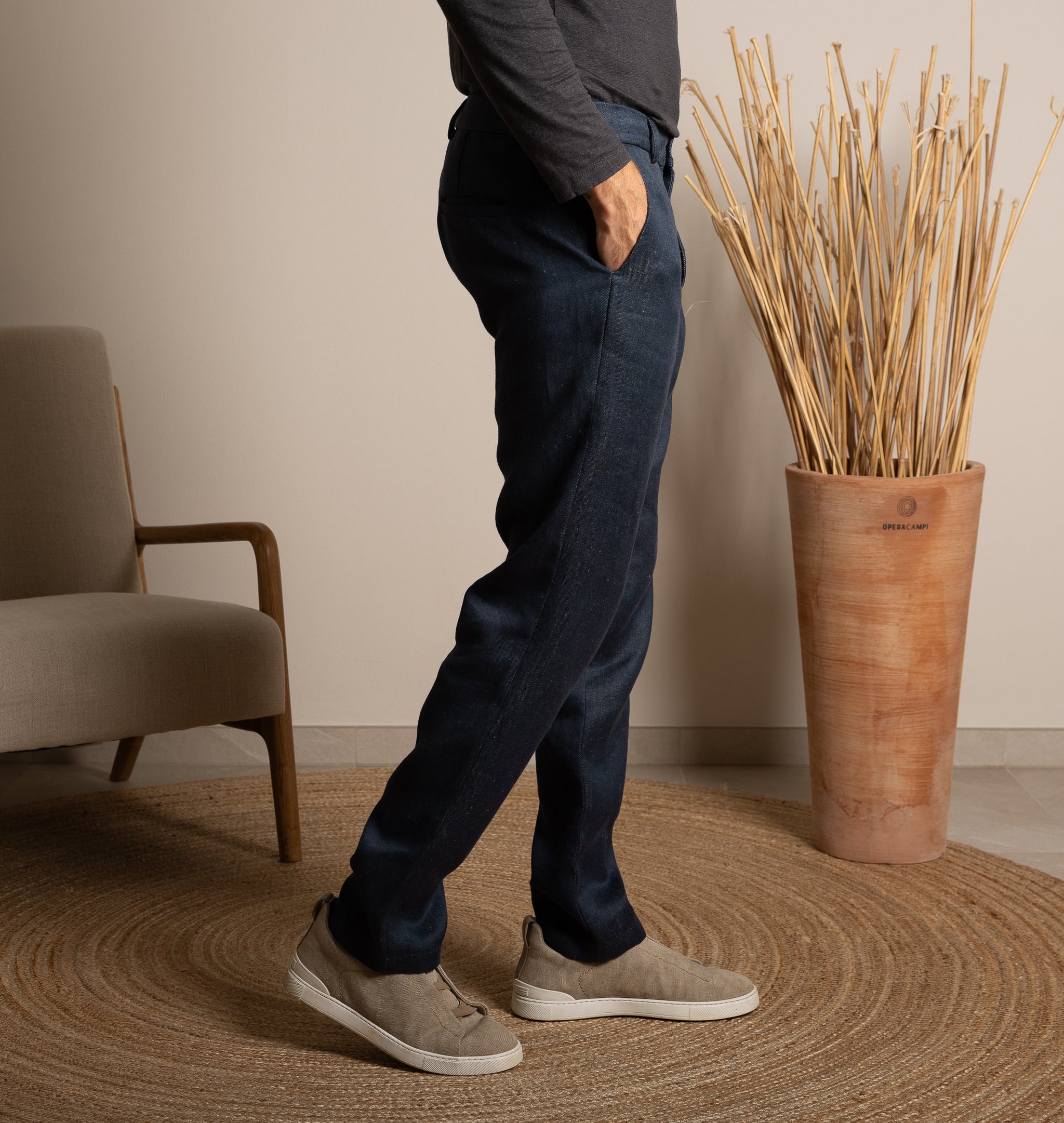 Il pantalone di canapa su misura, realizzato in Italia con i filati più pregiati. Taglio pulito, elegante e moderno.